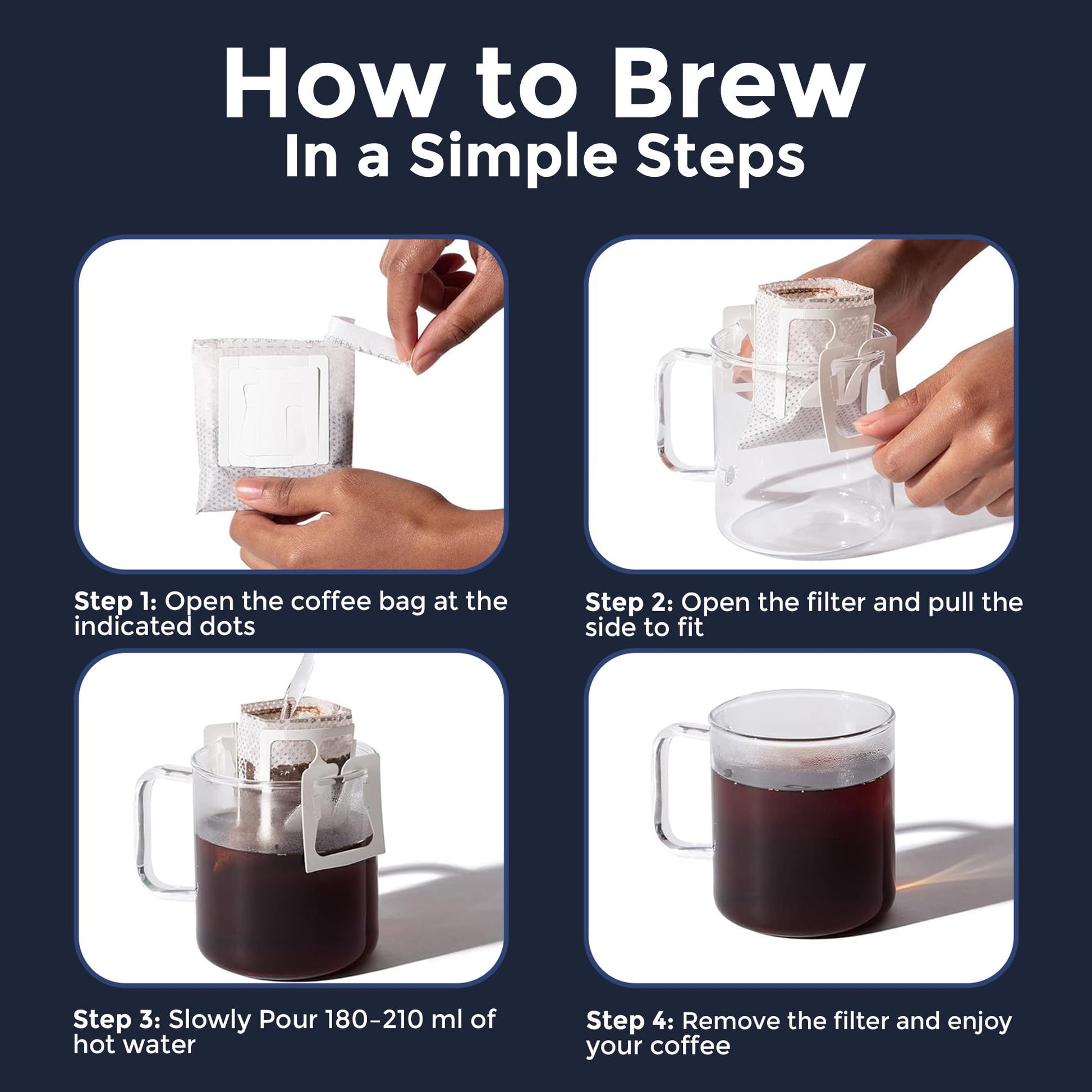 - Quick & Easy to Prepare Drip Coffee Pour Over Bags, No machines, no mess - Our convenient, single-serve drip coffee sachets are ideal for coffee lovers who are on the hurry while enjoying a delicious cup of Brazil coffee anywhere, anytime