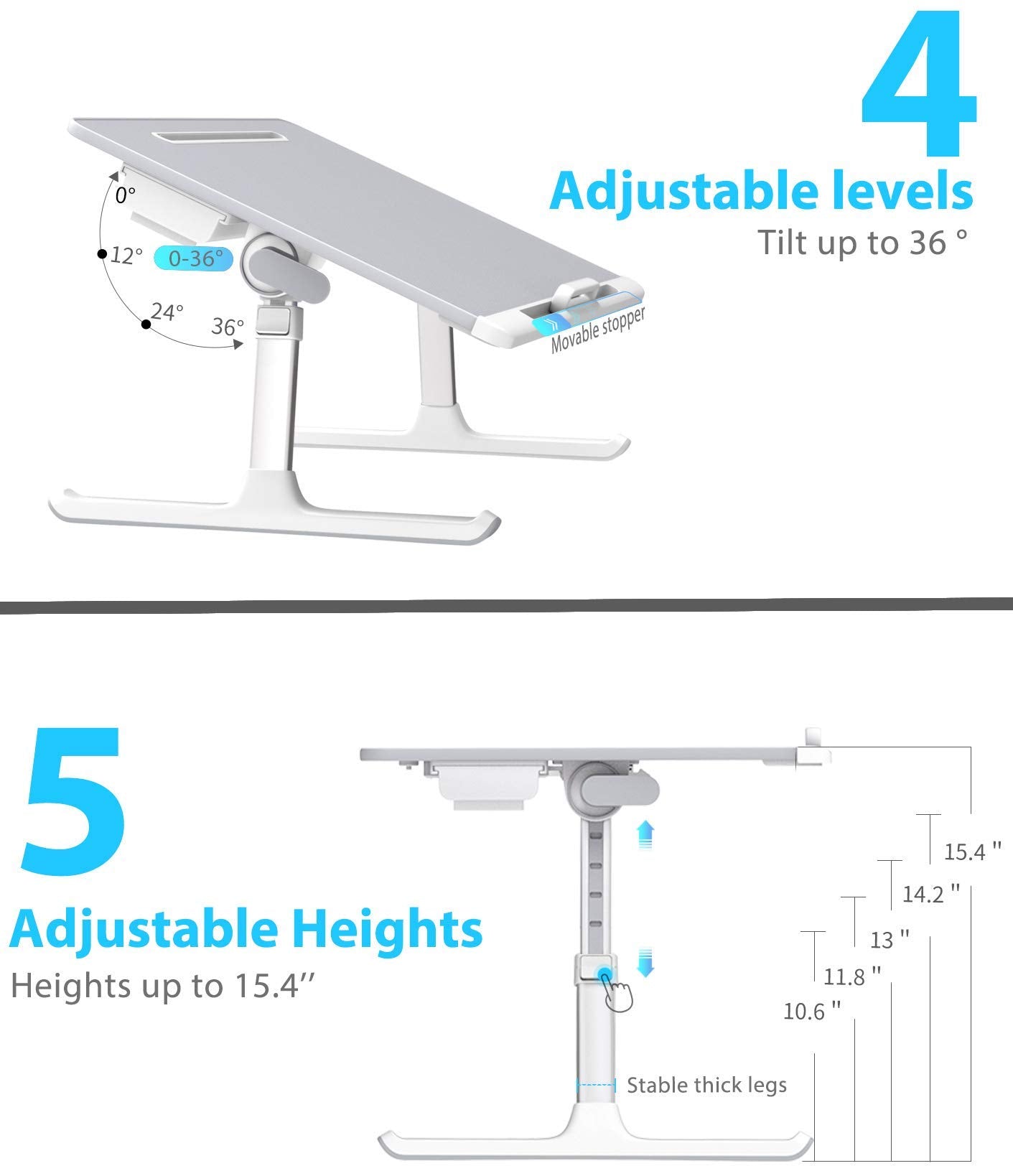 - [ADJUSTABLE LAPTOP TABLE]: Two auto-lock buttons on each side can make the quick change in height easily, Table legs can be set to 5 different heights (adjustable from 10.6" - 15.4"). In addition, two clamps can be used to adjust the surface angle, surface can be set to 4 different angles (from 0°-36°).