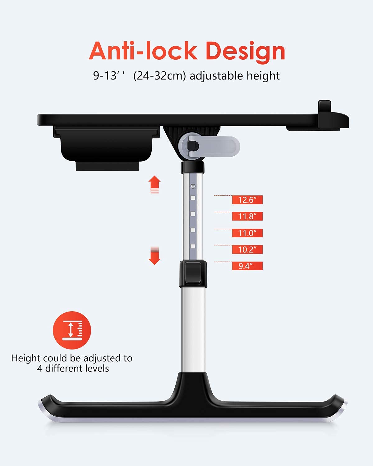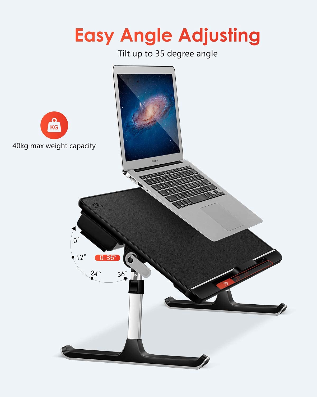 - [ADJUSTABLE LAPTOP BED TRAY TABLE]: Two auto-lock buttons on each side can make the quick change in height easily, table legs can be set to 5 different heights (adjustable from 9.4" - 12.6"). In addition, two clamps can be used to adjust the surface angle, surface can be set to 4 different angles (from 0-35°).